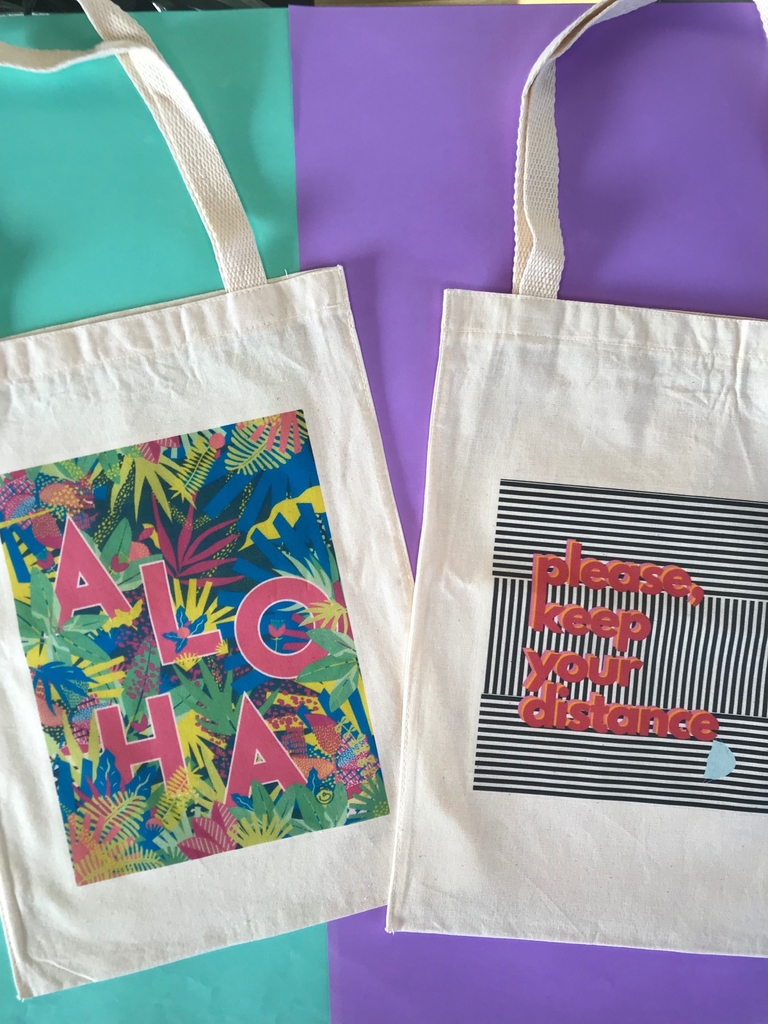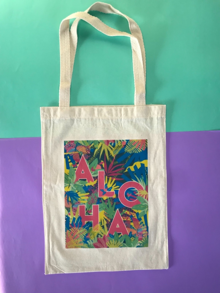 Ecobag cofeccionada em algodão cru, com alças de cordão de algodão sarjado e estampa localizada.